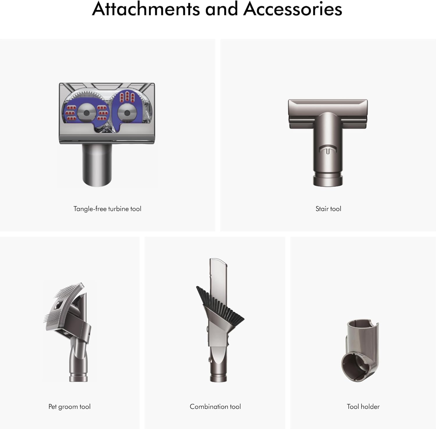 - 8 Dyson-engineered accessories include the tangle free turbine tool, combination tool, multi-angle brush, stair tool, reach under tool, carbon fiber soft dusting brush, mattress tool and tool bag.